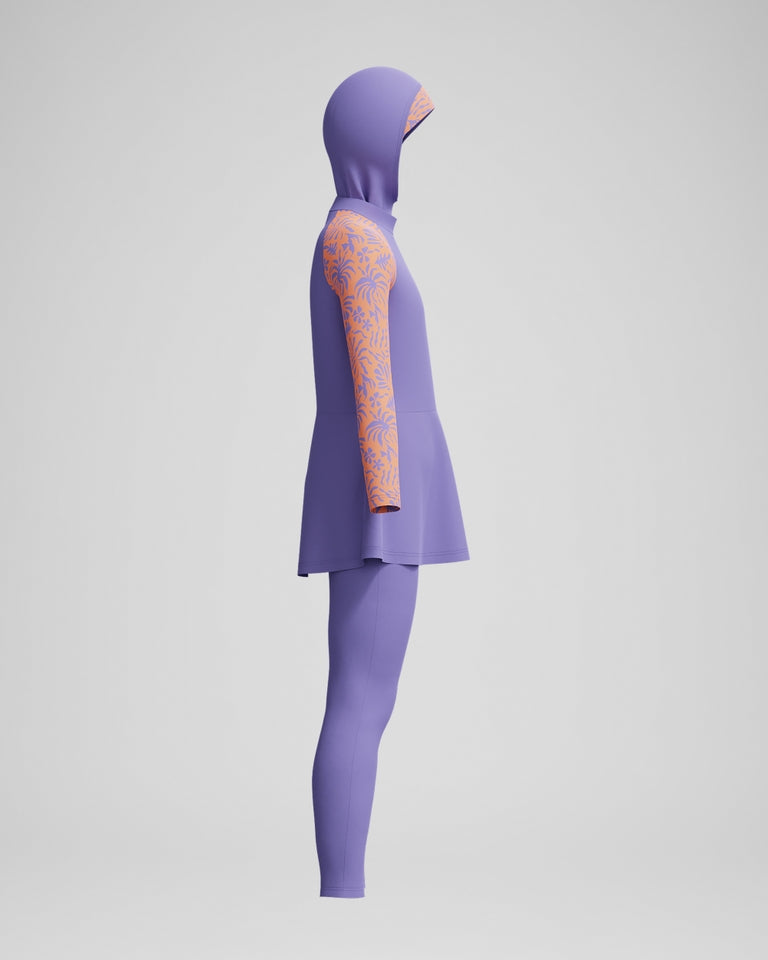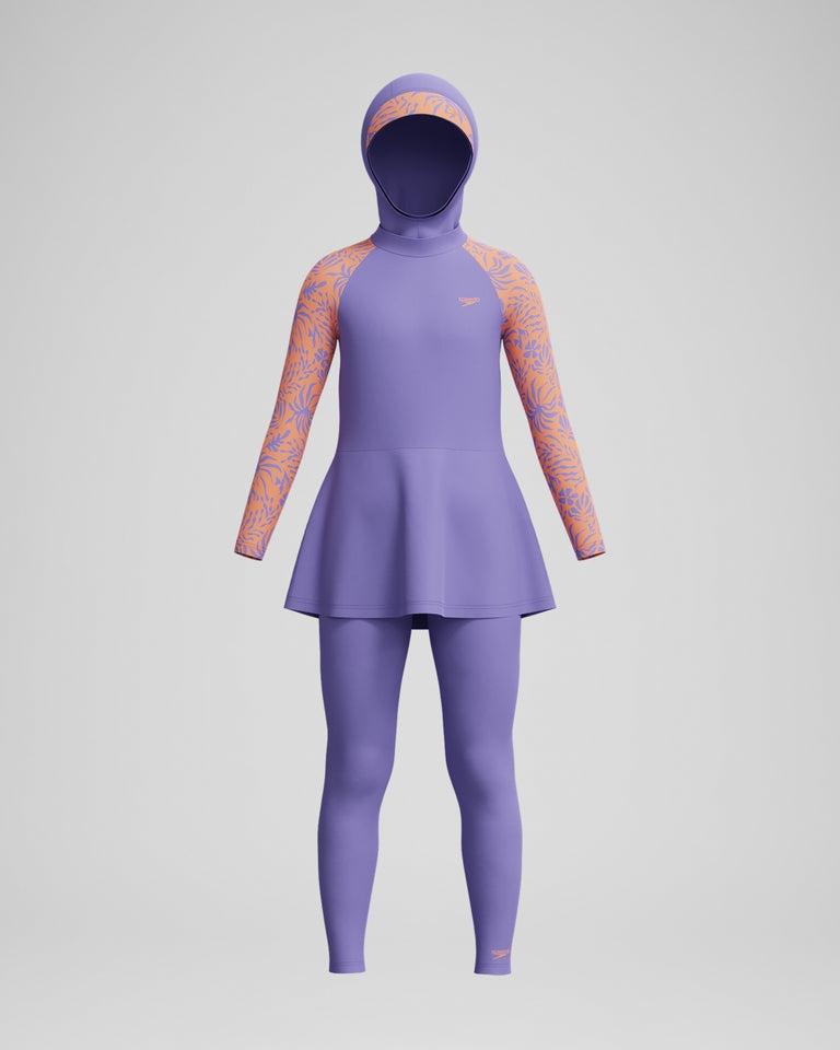 Take cover in style wearing our purple 3-piece Modesty Set, which features head-to-ankle coverage and leaf-print sleeves. Designed for juniors, it includes a swim-friendly head covering, a long-sleeve rash top with peplum bottom, and full-length leggings. Internal buttons connect the set for a secure fit, so your young swimmer can relax and enjoy the water. A bra shelf liner within the top provides support. Keep the fun going for longer with our EnduraBrite fabric, engineered with 4-way stretch and CREORA® HighClo™ for high chlorine resistance and superb shape retention. Body made of 82% Polyester, 18% Elastane (Creora® HighClo).