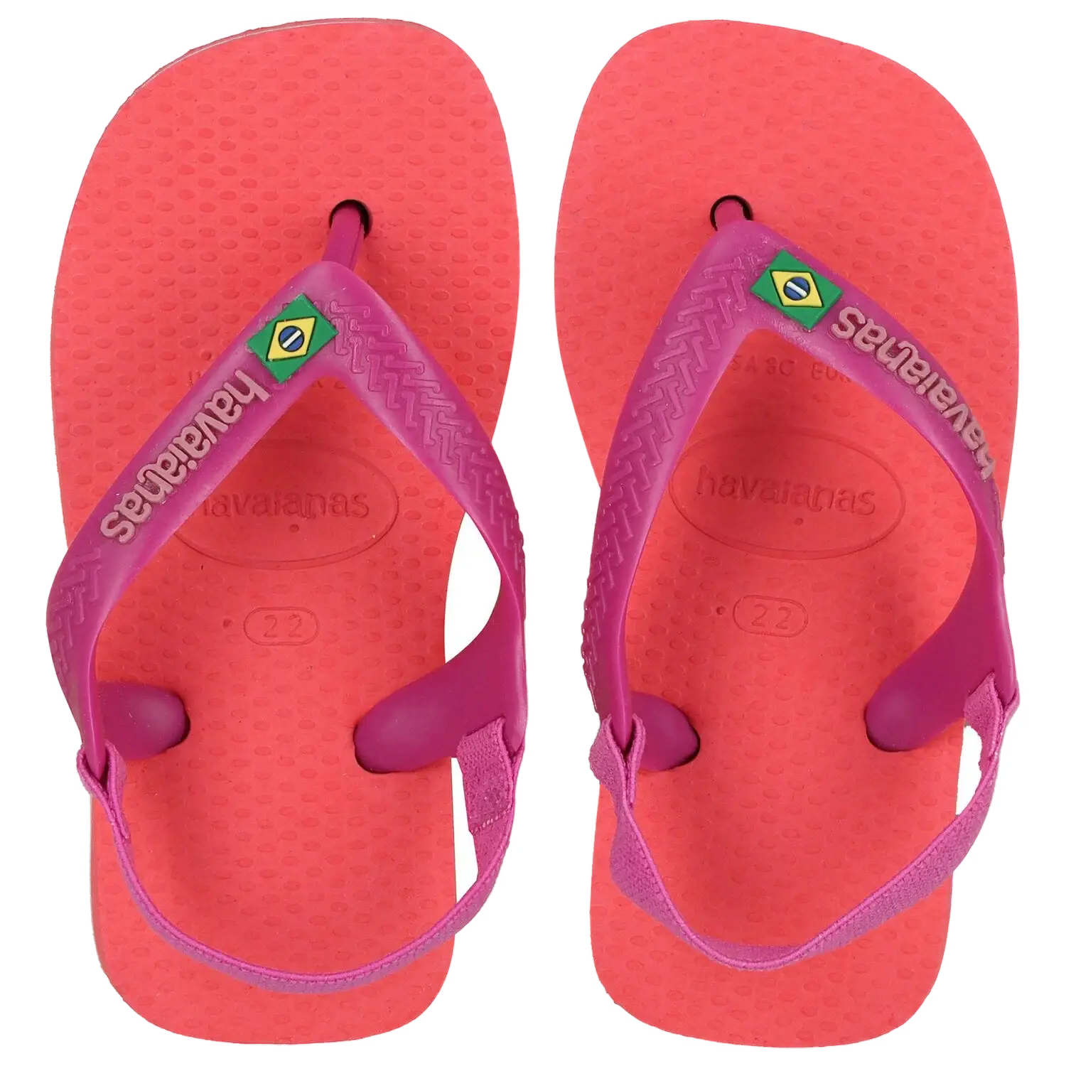 Pink logo flip flops for younger girls by Havaianas. They feature the pink strap with the brands logo and brazil flag and elasticated strap at the back. Comes with branded box.