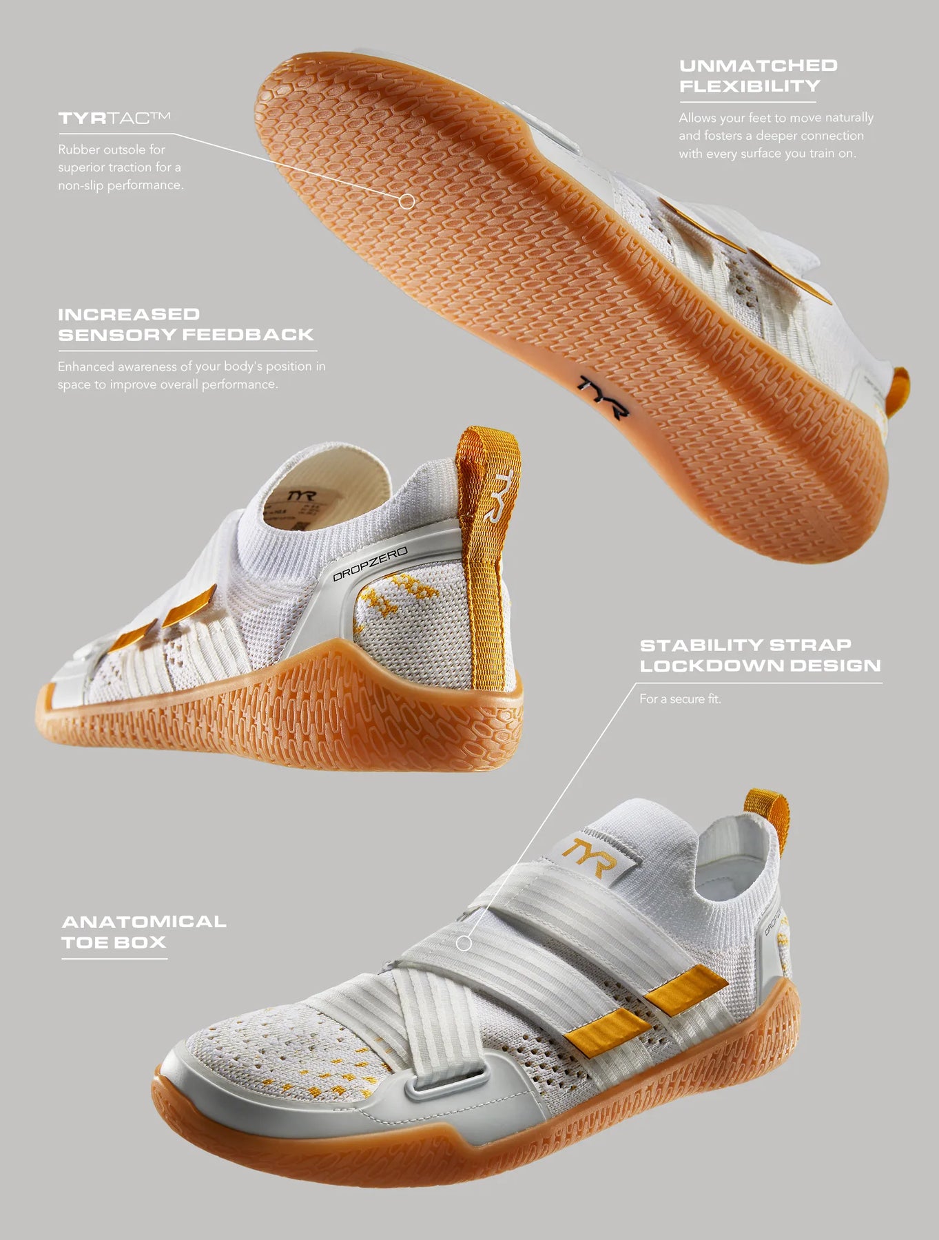 The TYR Men's DropZero Barefoot Stability Strap Trainer provides exceptional flexibility, allowing your feet to move naturally and enhancing your connection with any training surface. Its ergonomic design contours to the natural shape of your foot, while the ultra-thin TYRTac™ rubber outsole delivers superior ground feedback and traction across all surfaces. Equipped with an innovative stability strap, the DropZero trainer offers added support for seamless integration of lifting into your workout routine, ensuring comfort and stability throughout.