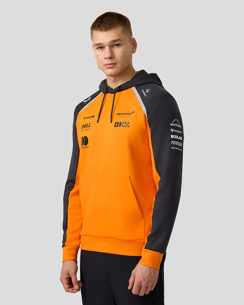 Set new standards in the Official Unisex McLaren Formula 1 Team Hoodie, specially engineered for professional performance and continuous progression. Its three-piece hood will help to shield against unpredictable weather conditions, offering wearers a personalised fit thanks to its adjustable drawcord design. Keep your valuables safe and secure in the spacious kangaroo pocket. Screen-printed team branding and logos show you’ll stand firm with McLaren’s Forever Forward ethos throughout the 2025 Formula 1 season.