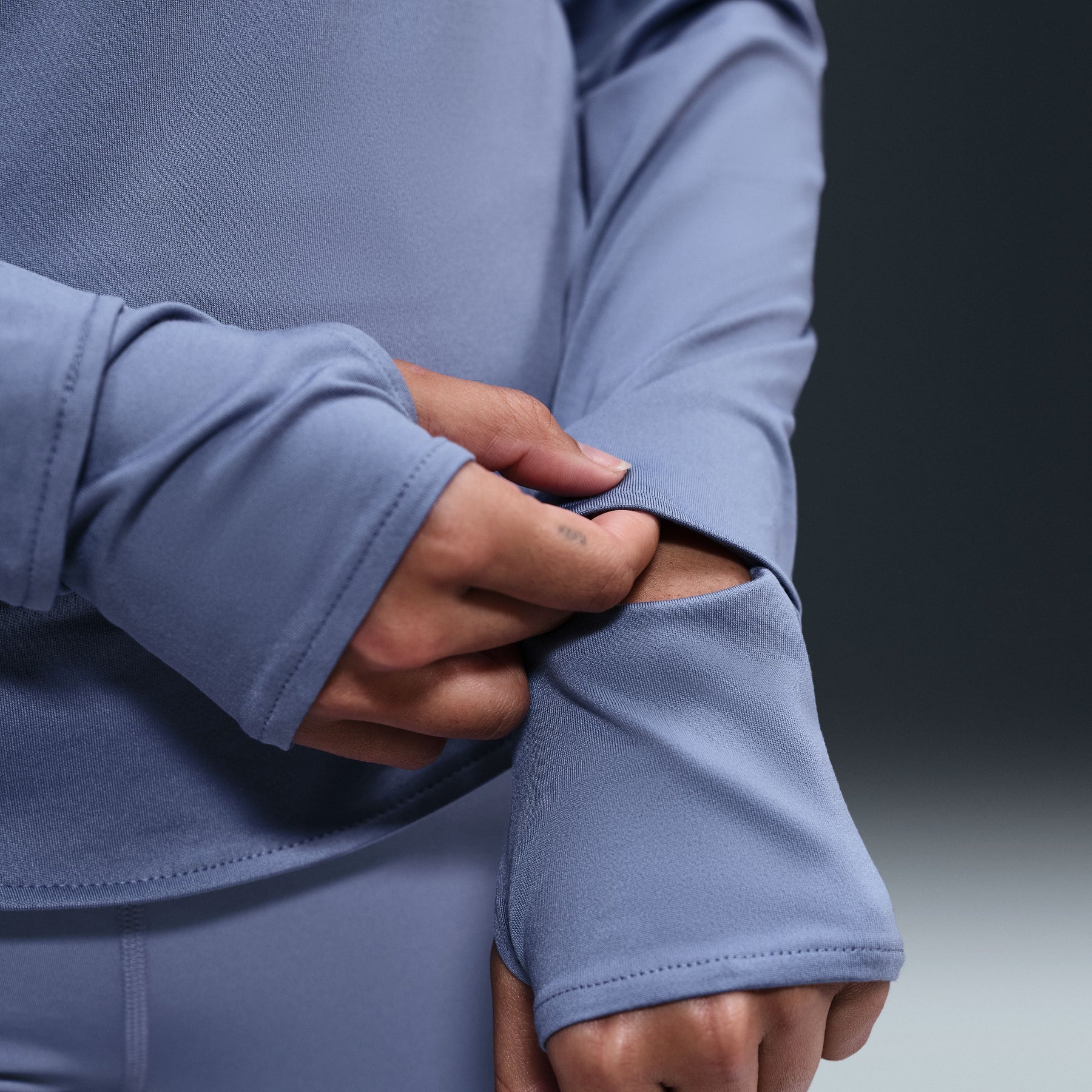 The top is tapered around the waist so that layering with other pieces is easier. A curved hem helps keep you covered through your stride. Plus, thumbholes let you extend your coverage and help hold the sleeves in place.
