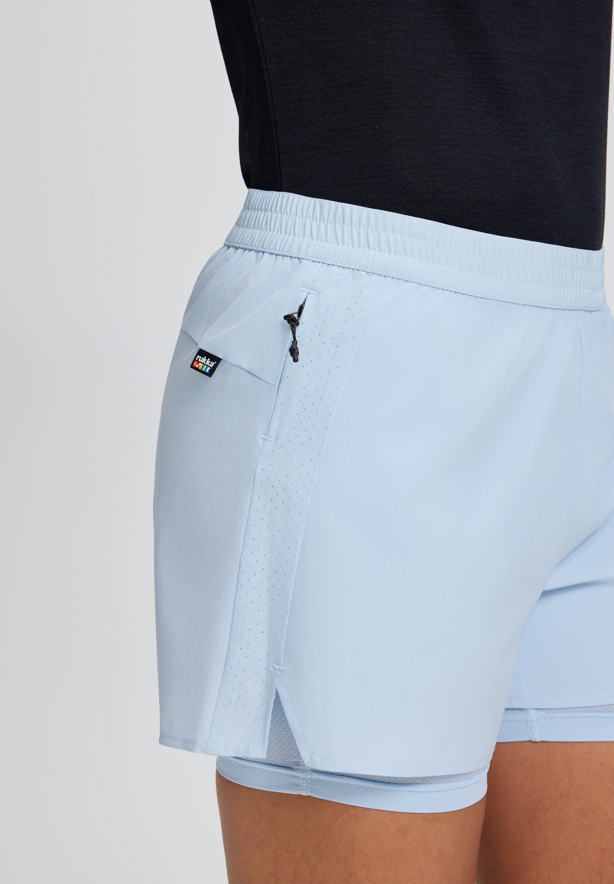 Rukka 2-in-1 shorts for women. Zipped key pocket at the side. Elastic waist with a drawstring. Regular waist. Laser-cut ventilations. Inner shorts. The 4-way stretch material stretches in all directions giving maximum freedom of movement. The fabric allows moisture to evaporate quickly, keeping you dry and comfortable at all times.