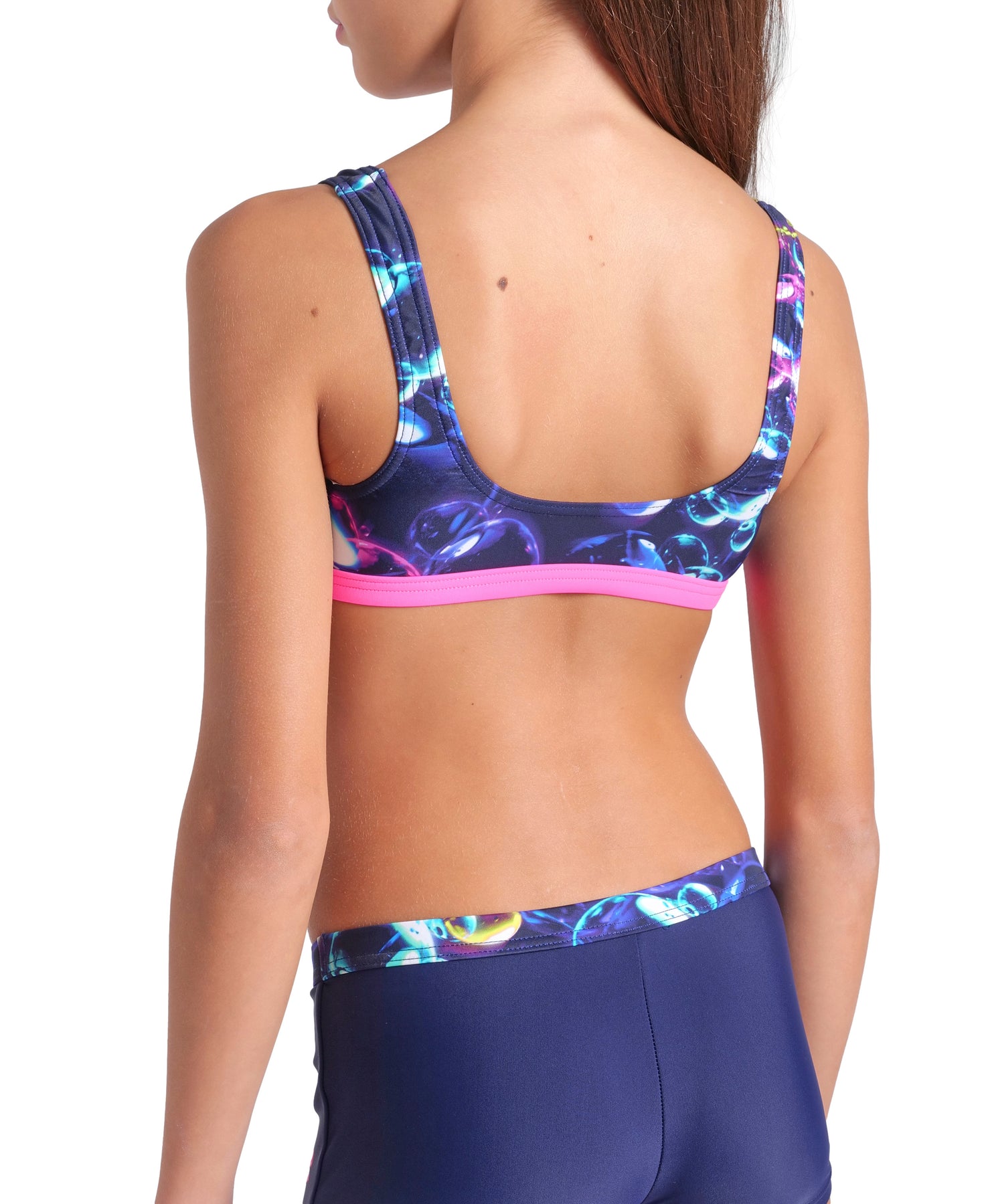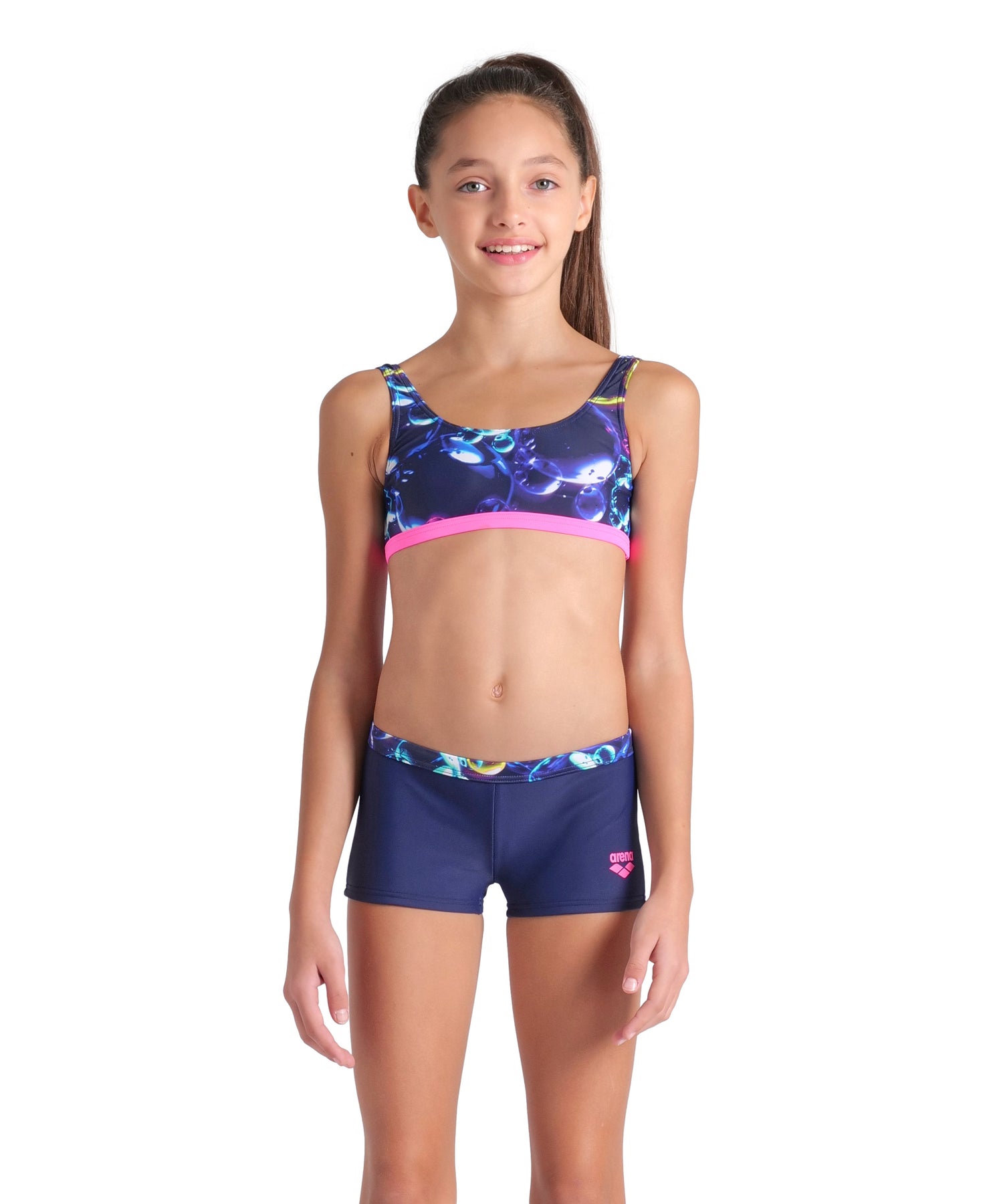 The super stretchy and sporty Soap Bubbles Bralette Bikini for girls is part of the extremely comfortable arena Feel line and fits like a second skin. It is ideal for fitness and leisure swimmers doing any water activity at the pool, at the beach and in any other body of water. Made of chlorine and saltwater-resistant MaxFit Eco with integrated UPF 50+ UV protection, this 4-way stretch fabric guarantees a perfect fit, maximum freedom of movement and outstanding comfort. It is the eco-friendly evolution of arena's MaxFit fabric and is made with recycled polyamide. The bikini top with wide straps guarantees a secure fit while swimming or doing beach activities. The bikini briefs are equipped with an internal drawstring for a perfect fit. The soft front lining offers additional comfort. The fabric's OEKO-TEX® STANDARD 100 certification means it has been tested for harmful substances and is harmless to human health and the environment.