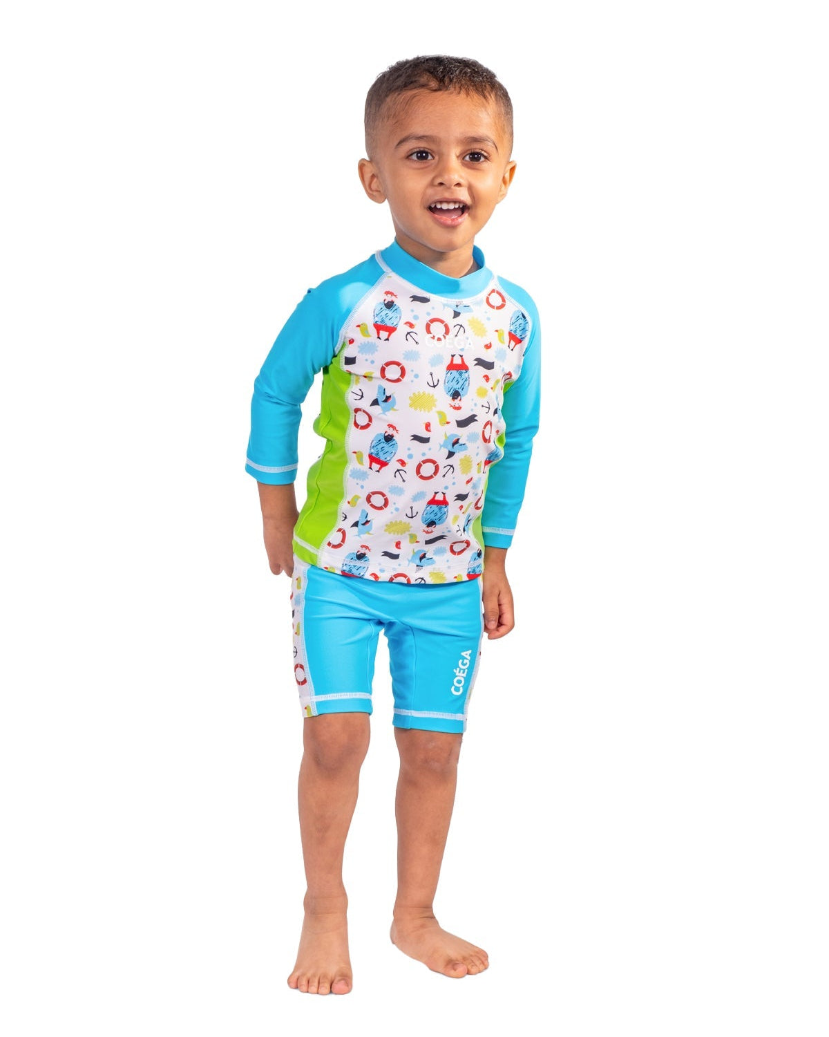 This convenient and unique two-piece design provides comfort and sun protection for your little one while enjoying the beach or pool. Stretchable and soft, the outfit includes a long-sleeve rash guard and matching swim diaper. The rash guard is designed with half zip in the back to allow for quick and easy access. The shorts have an elasticated waist for easy on/off and flexible fitting. Our lightweight fabric provide comfort and freedom of movement during active water play. The chlorine and saltwater resistant fabric retains its shape and dries quickly all while providing much needed UV50+ protection, so your little sun seeker can Go Ahead and Love the Sun! Add a matching Swim Diaper to the set.