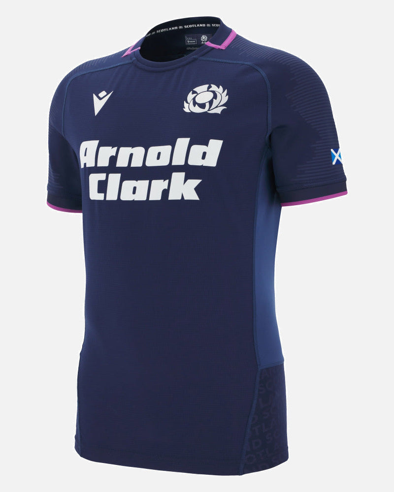 2025/26 home match shirt - navy tight fit shirt with embossed soundwave pattern over the shoulders, round collar with purple details and white Scotland crest embroidered over the heart.