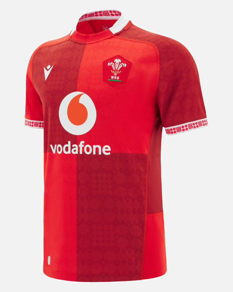 2025/26 home replica shirt - red relaxed fit shirt with two tone quartered design featuring an embossed Caernarfon pattern over the body and sleeves, white details on the collar and cuffs and embroidered logo over the heart.