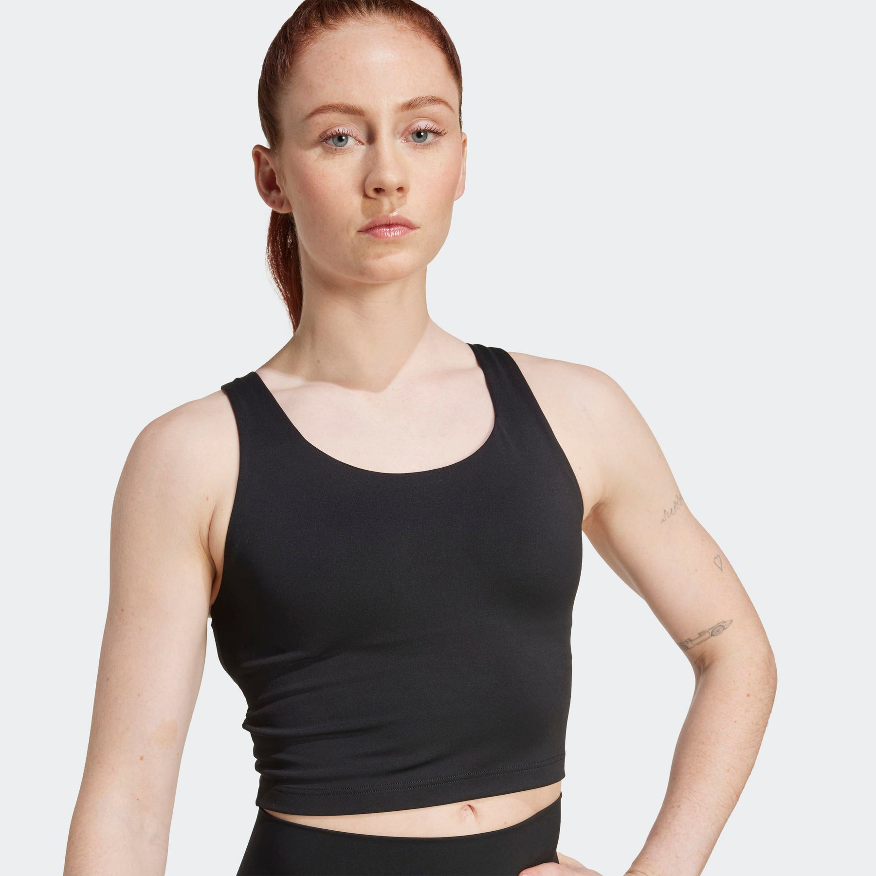 Challenge yourself during barre, sculpt or cardio classes in this adidas bra. Medium support allows you to flow freely through workouts with ease and comfort. Smooth AdiSOFT fabric feels feather-light against your skin. The flattering tank silhouette stays in place so you can wear it without a tee. Built-in pads deliver coverage with a natural shape.