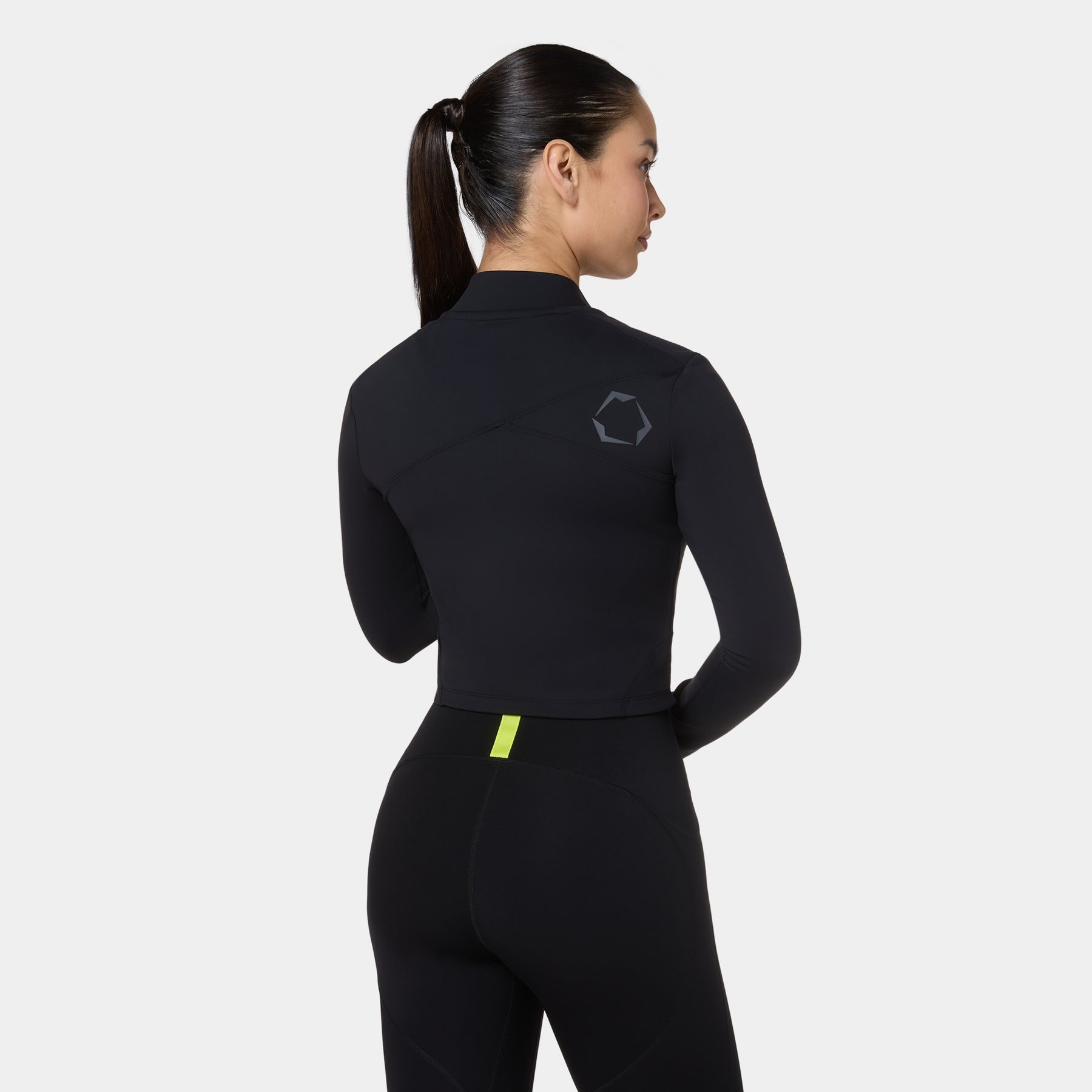 - Cropped track jacket with mandarin collar and full-zip front.